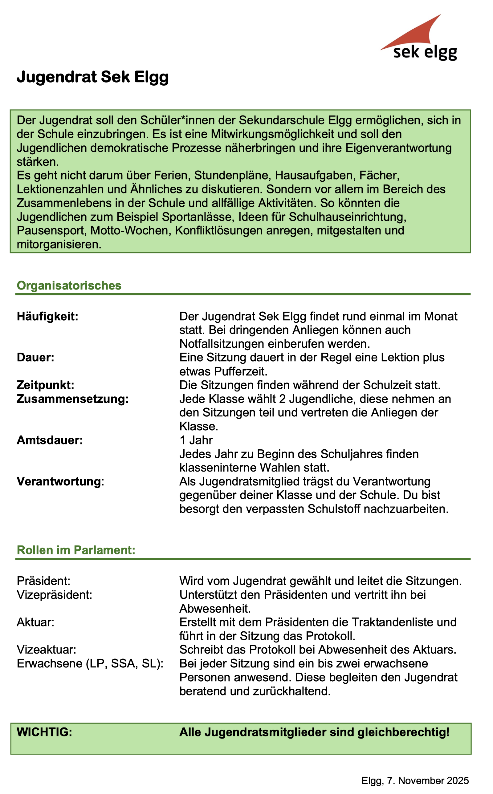 Der Jugendrat Sek Elgg ist das parlamentarische Gremium der Sekundarschule Elgg der Schüler:innen. Der Jugendrat tagt im Kalenderjahr 25/26 in regelmässigen Abständen, gesamthaft neun Mal. Aus allen Klassen wurden zwei Delegierte gewählt, die an den Sitzungen teilnehmen. Diese werden durch den vom Rat gewählten Präsidenten geleitet, der in seinem Amt durch den Vizepräsidenten und die Protokollführenden unterstützt wird. Die Lehrerschaft und die Schulsozialarbeit haben jeweils einen beratenden Sitz im Rat.