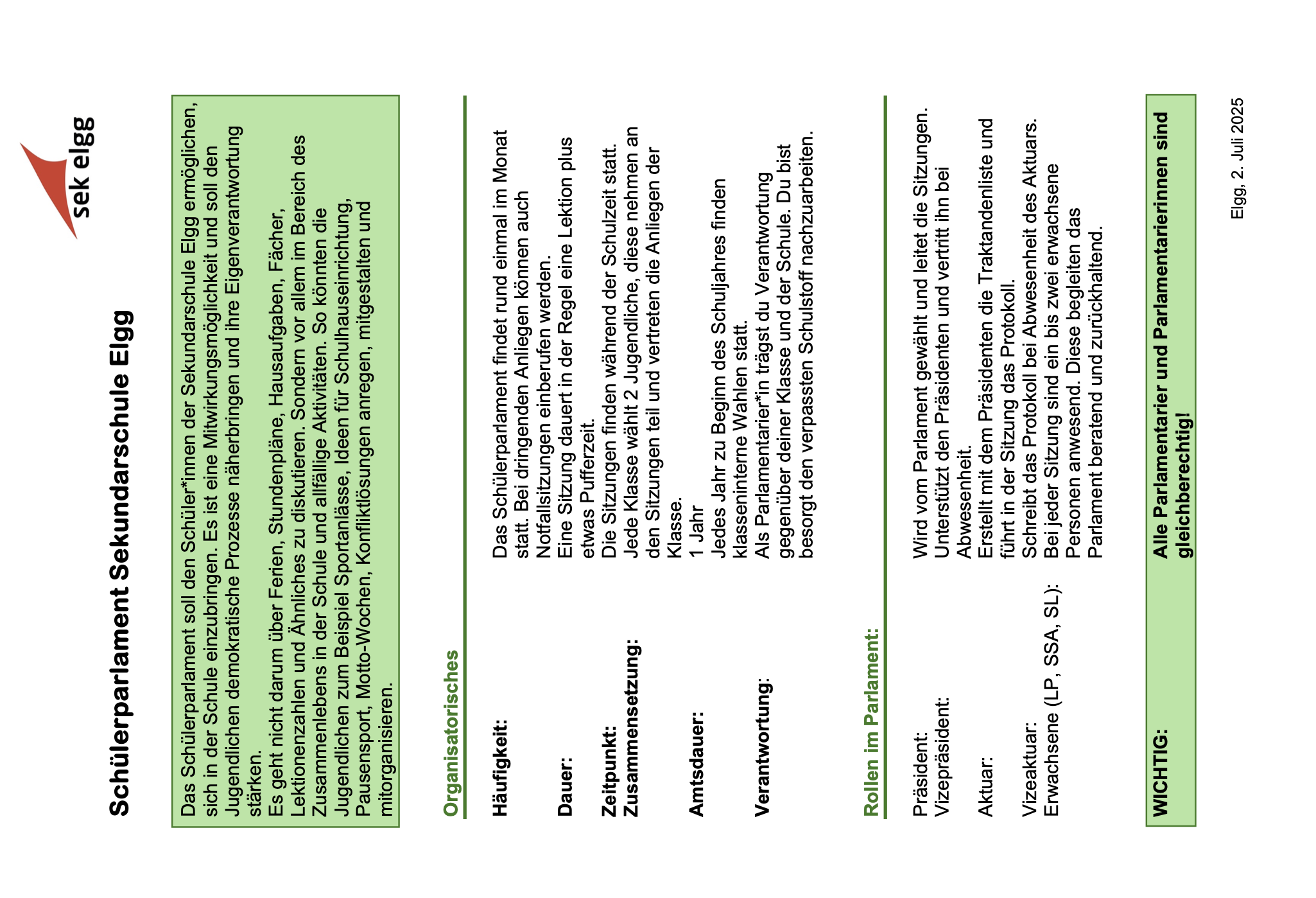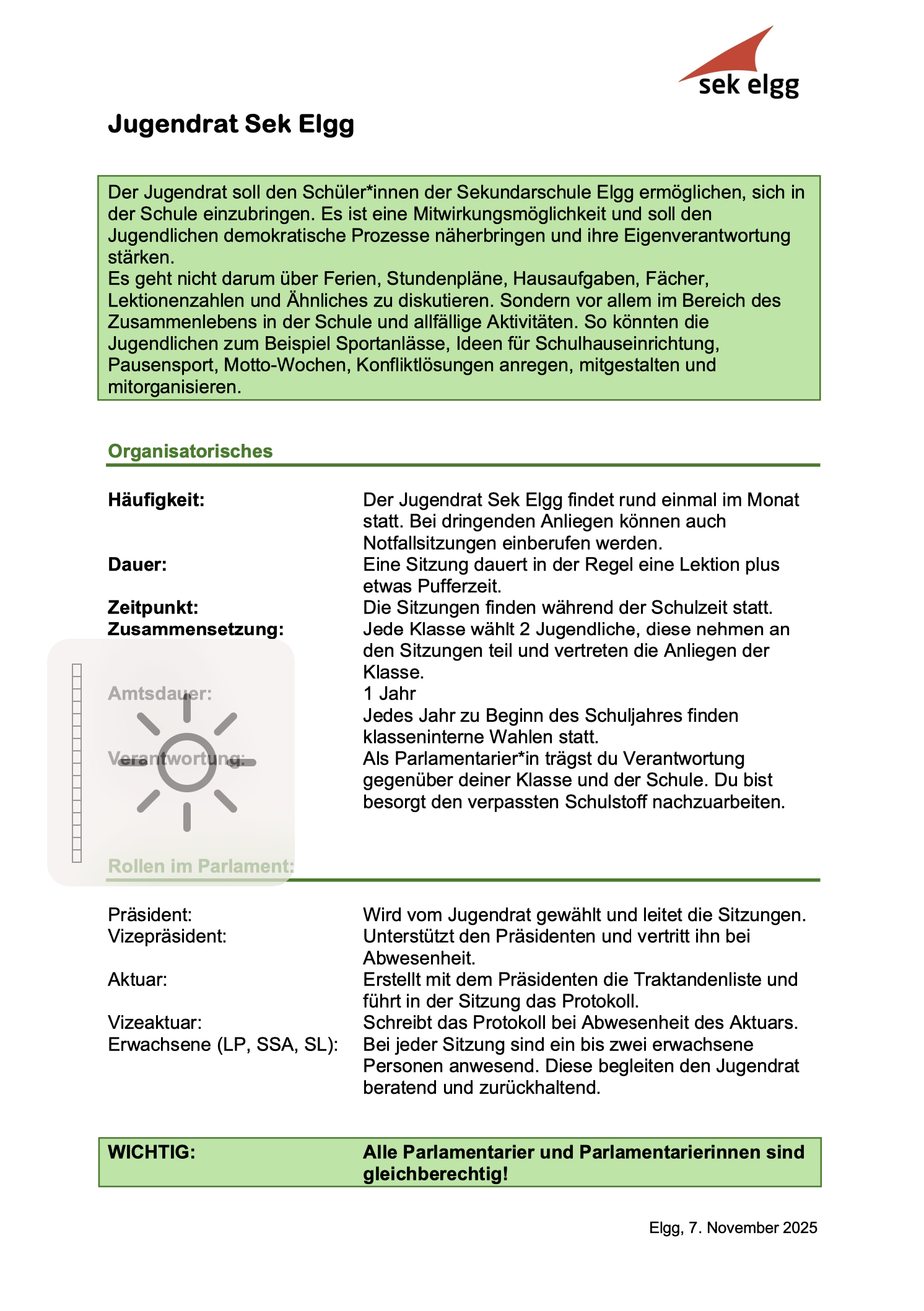 Der Jugendrat Sek Elgg ist das parlamentarische Gremium der Sekundarschule Elgg der Schüler:innen. Der Jugendrat tagt im Kalenderjahr 25/26 in regelmässigen Abständen, gesamthaft neun Mal. Aus allen Klassen wurden zwei Delegierte gewählt, die an den Sitzungen teilnehmen. Diese werden durch den vom Rat gewählten Präsidenten geleitet, der in seinem Amt durch den Vizepräsidenten und die Protokollführenden unterstützt wird. Die Lehrerschaft und die Schulsozialarbeit haben jeweils einen beratenden Sitz im Rat.