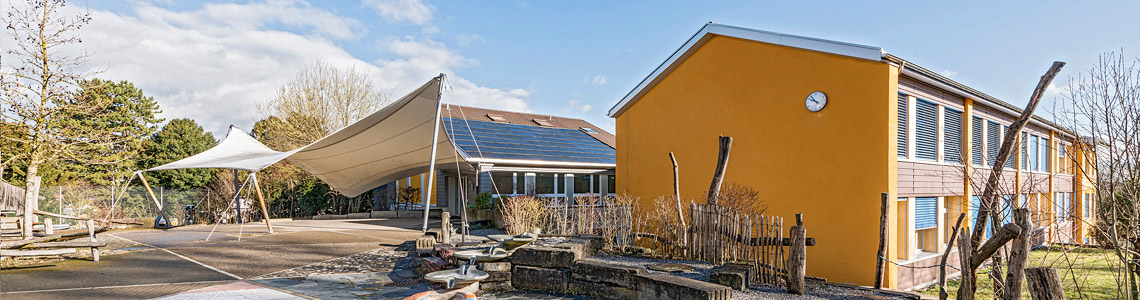 Der Pausenplatz lädt mit Sitzmöglichkeiten zum Verweilen ein, bietet mit dem roten Platz die Möglichkeit sich auszutoben und der tägliche Besuch des Bäckers in der 10UhrPause sorgt für das leibliche Wohl.